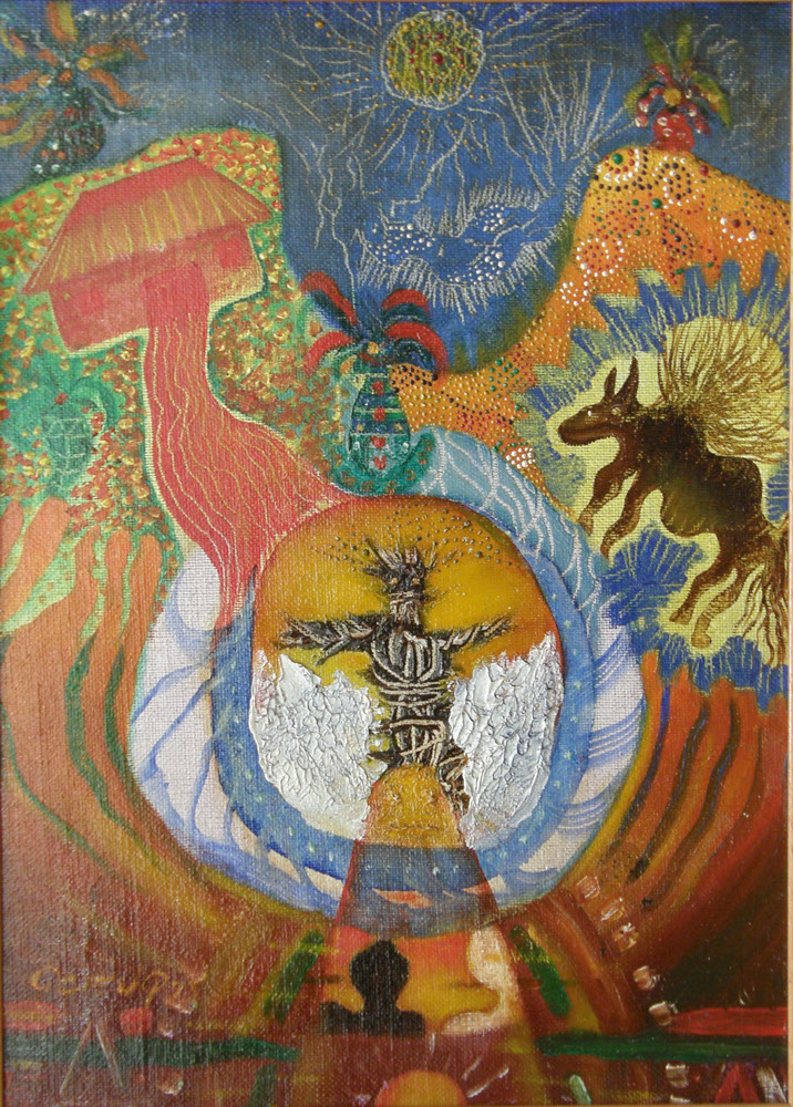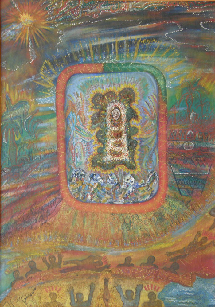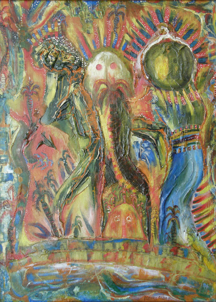 The painting of self-taught artist Miguel de Jesús Ocejo (Santiago de Cuba, 1940-Havana, 2006) reflects the particular social and cultural environment he was born into and where he took his first steps. In his paintings we see the panorama of the popular religions of eastern Cuba, characterized by elements of the cults of the first inhabitants of our is- land, visual references derived from Franco- Haitian ceremonies, and by multiple visual elements of spiritism.