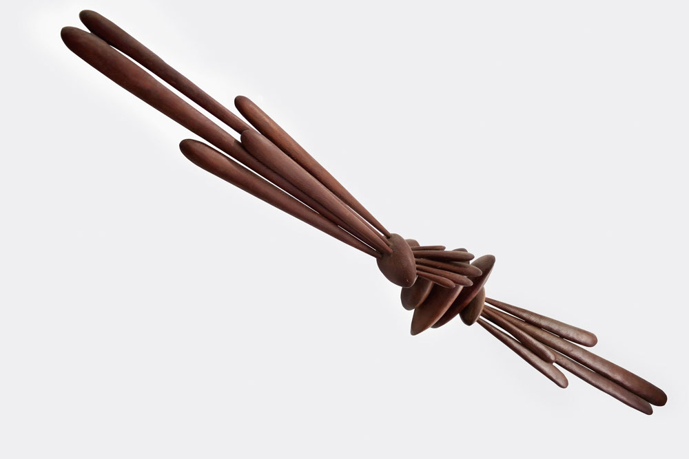 In his woodcarvings he develops elements based on pre-Columbian petaloid stone hatchets. He assembles pieces in carved wood in different sizes, the surface of which has a subtle texture, reproducing Taino sculptural forms. These pieces draw on the historical accounts inspired by the cults of the dead overseen by Behiques, or priests. Aspects of the stories were recorded by the Chroniclers of the Indies, upon describing objects, ceremonies, and animistic beliefs among the Tainos. He has also recreated sculptural elements in shapes that recall Taino tools, based on stone artifacts found in archaeological zones in eastern Cuba.