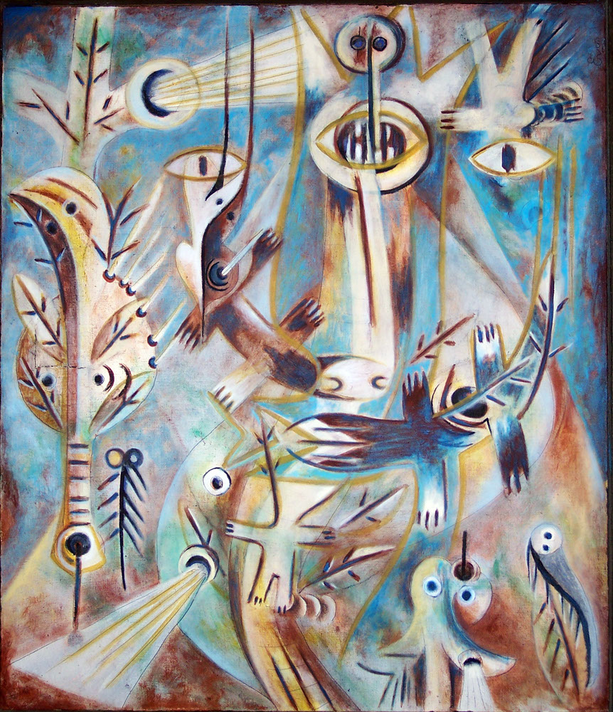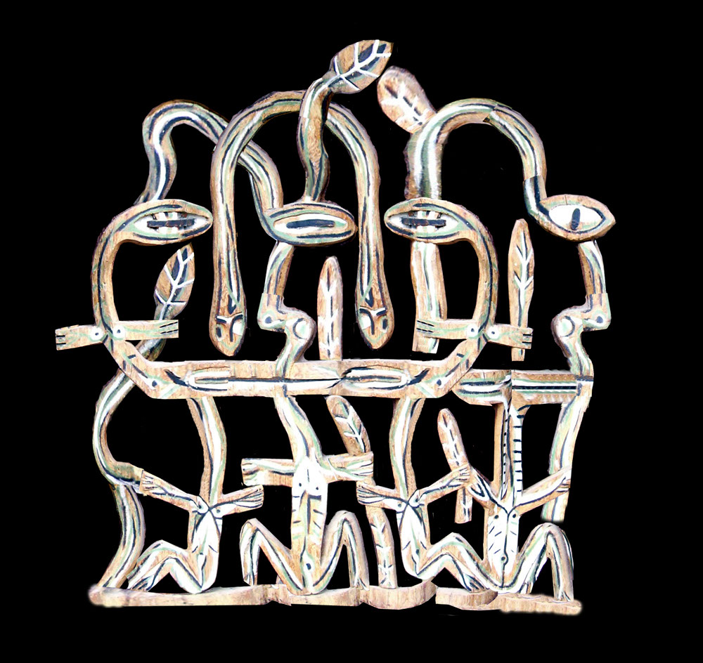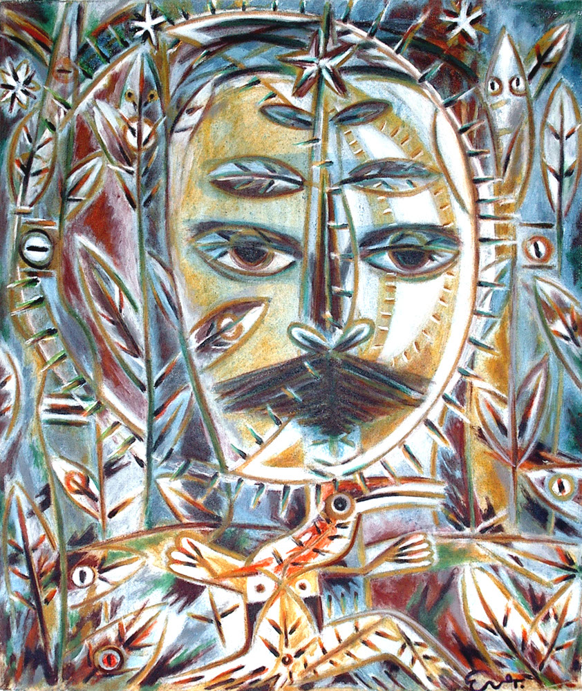 In his paintings, done in somber colors, the black lines high- light the human figures, to which zoomorphic elements were attached, tangled in the two-dimensional surface. They described a multi-level evocation of existence, like a great circle making up the stage of life itself. Full of great expressive strength, his figures, with wide-open eyes, float in the space of the picture. They are allusions to the sun, the moon, the world of latent shafts of sunlight intermingled with animals like the chameleon, fish, and butterflies. The animals represent the multiple stories of the emergence and transformations of the various species, expressing the permanent metamorphosis of living things, in continuous interaction with humans.