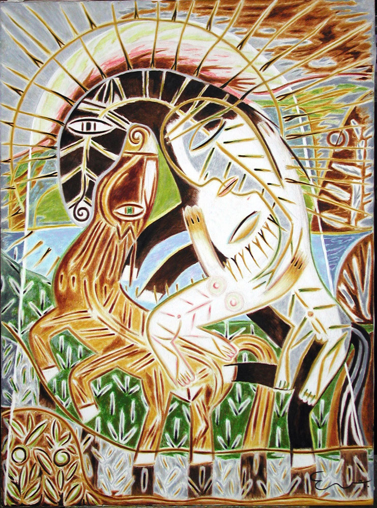 Always upbeat, imbued with family connections and the symbolic characters that lived in the Cuban landscape, the source of many legends of the country people, Ever Fonseca began to paint large canvasses overflowing with the tenacious and imaginative stream coming up from the deepest roots of his land.