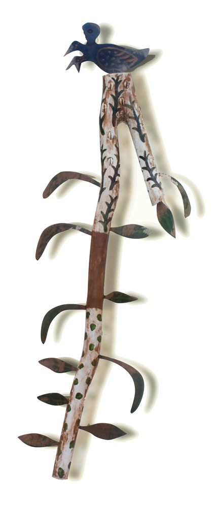 Mendive has produced his art in several media, including painting on canvas and on royal palm trunks, sculpture in wood, textiles into which he has integrated fiber, cowrie shells, wood fragments, and cloth, which were then cast in bronze, projecting a richness of texture on the final material.