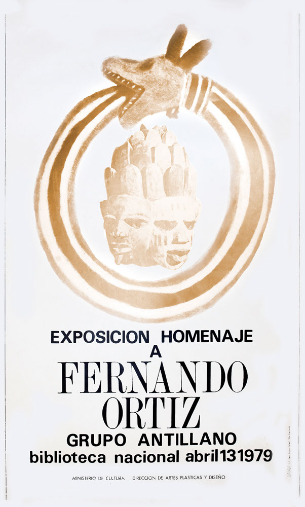 activity as old as it is beautiful. As a designer he shaped the graphic look of the posters for Grupo Antillano’s exhibitions. We should recall, for example, the outstanding poster he did for the April 1979 exhibition in tribute to Don Fernando Ortiz, in the National Library, or the catalogue for the January 1980 exhibition of the Grupo Antillano in the House of Cuban Culture in Prague.