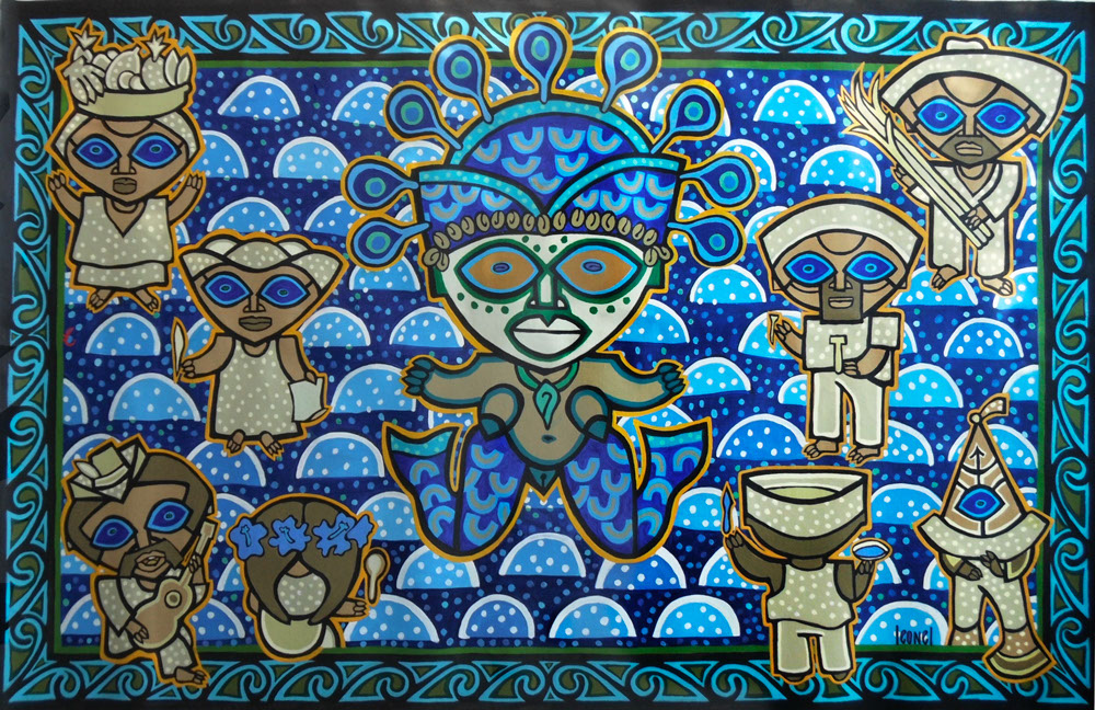 Leonel with his embodiments of the pantheon of the liturgy of the Regla de Ocha or Santería associates beauty with harmony of the physiognomy with the brilliance of composition in the style of medieval Catalan art and the naive art of the land of the Yorubas. These are the ritual elements that distinguish them: the stars and the four winds of Oya, the willful warrior in her multicolor flowering world, armed with arrows, deer and tigers in shades of ocher; the greens of Ochosi, the hunter, paired with Oggún, the warrior; Elegguá with gourds, toys, tops, kites, the tireless child of the fates; Changó the warrior, lover with his Oché thunder axes, horse, palm fronds, surrounded in red and white by his eternal loves—Oya, Ochún, and Obba.