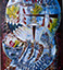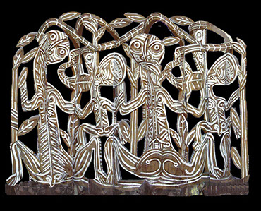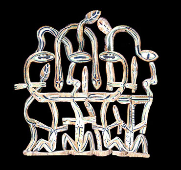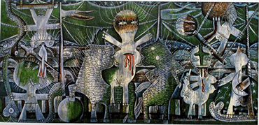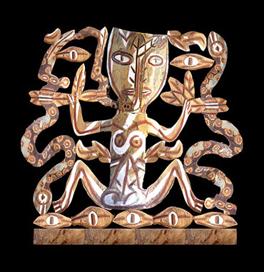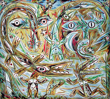 In his paintings, done in somber colors, the black lines high- light the human figures, to which zoomorphic elements were attached, tangled in the two-dimensional surface. They described a multi-level evocation of existence, like a great circle making up the stage of life itself. Full of great expressive strength, his figures, with wide-open eyes, float in the space of the picture. They are allusions to the sun, the moon, the world of latent shafts of sunlight intermingled with animals like the chameleon, fish, and butterflies. The animals represent the multiple stories of the emergence and transformations of the various species, expressing the permanent metamorphosis of living things, in continuous interaction with humans.