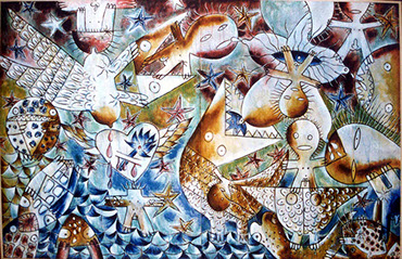 Always upbeat, imbued with family connections and the symbolic characters that lived in the Cuban landscape, the source of many legends of the country people, Ever Fonseca began to paint large canvasses overflowing with the tenacious and imaginative stream coming up from the deepest roots of his land.