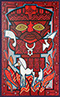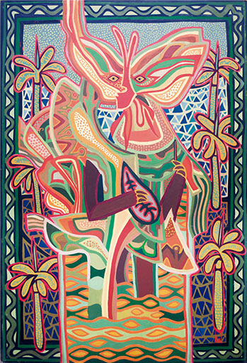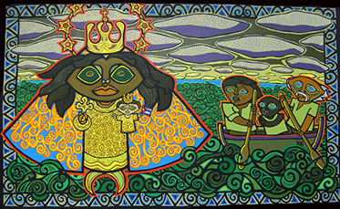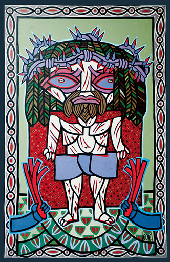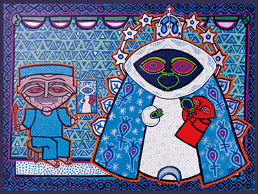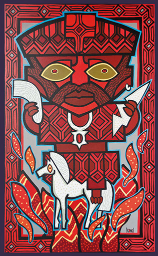 Leonel with his embodiments of the pantheon of the liturgy of the Regla de Ocha or Santería associates beauty with harmony of the physiognomy with the brilliance of composition in the style of medieval Catalan art and the naive art of the land of the Yorubas. These are the ritual elements that distinguish them: the stars and the four winds of Oya, the willful warrior in her multicolor flowering world, armed with arrows, deer and tigers in shades of ocher; the greens of Ochosi, the hunter, paired with Oggún, the warrior; Elegguá with gourds, toys, tops, kites, the tireless child of the fates; Changó the warrior, lover with his Oché thunder axes, horse, palm fronds, surrounded in red and white by his eternal loves—Oya, Ochún, and Obba.