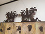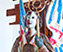 Leonel with his embodiments of the pantheon of the liturgy of the Regla de Ocha or Santería associates beauty with harmony of the physiognomy with the brilliance of composition in the style of medieval Catalan art and the naive art of the land of the Yorubas. These are the ritual elements that distinguish them: the stars and the four winds of Oya, the willful warrior in her multicolor flowering world, armed with arrows, deer and tigers in shades of ocher; the greens of Ochosi, the hunter, paired with Oggún, the warrior; Elegguá with gourds, toys, tops, kites, the tireless child of the fates; Changó the warrior, lover with his Oché thunder axes, horse, palm fronds, surrounded in red and white by his eternal loves—Oya, Ochún, and Obba.
